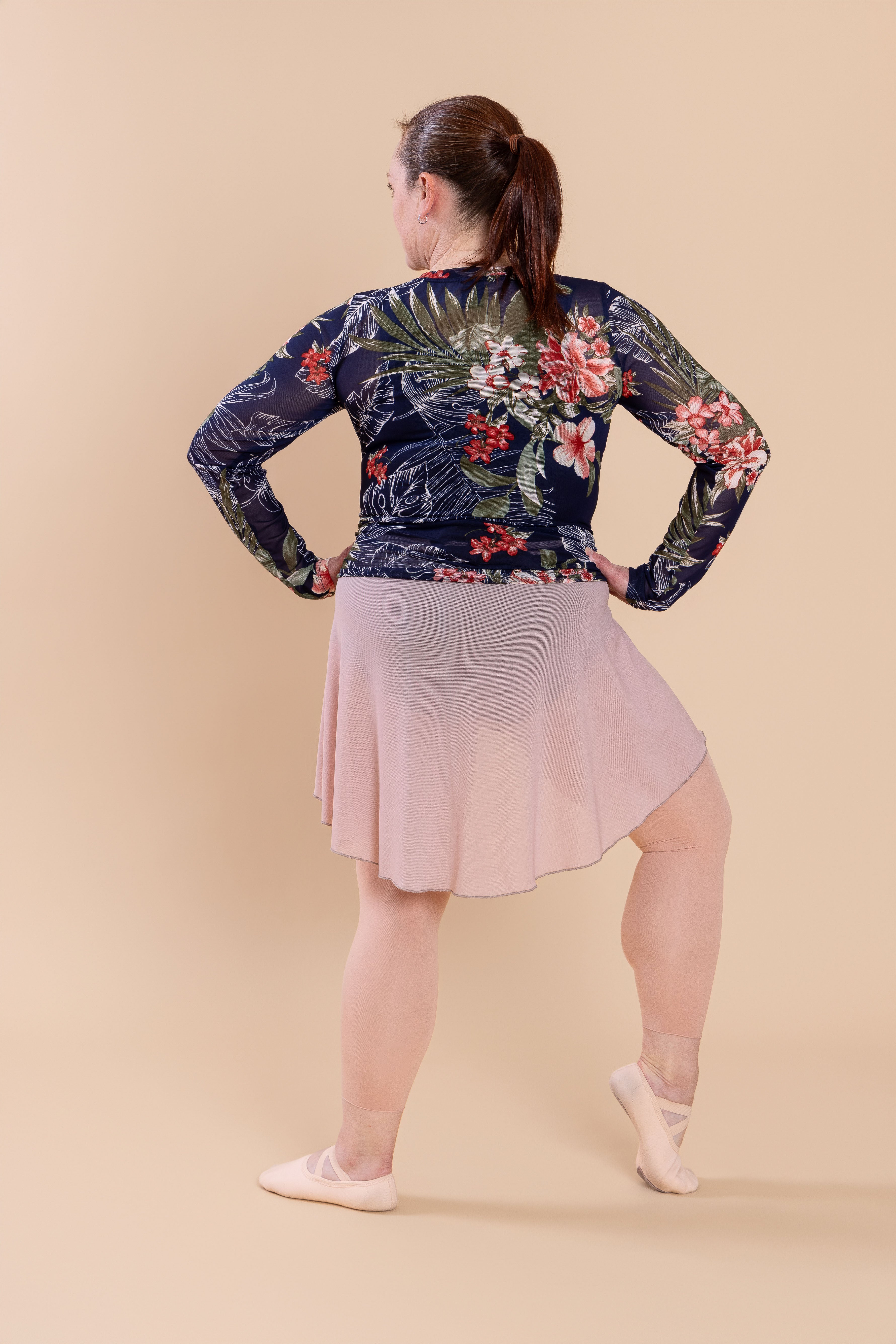 Everyone loves a flattering mesh top! Our sheer cover up is perfect over our Leo-top, or a leotard, and will take you from studio to coffee shop.